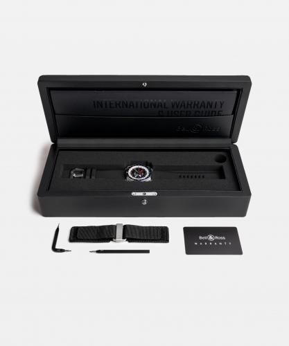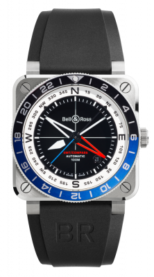 旅人のために設計されたBR-03 GMTコンパス。42mmのスクエアケースと24時間目盛り付き二色ベゼルで、現地時間と目的地の時刻を同時に確認できます。100m防水、BR-CAL.303自動巻きムーブメント搭載(パワーリザーブ54時間)。堅牢かつ精密なこの時計は、Bell & Rossならではの機能美を表現しています。
