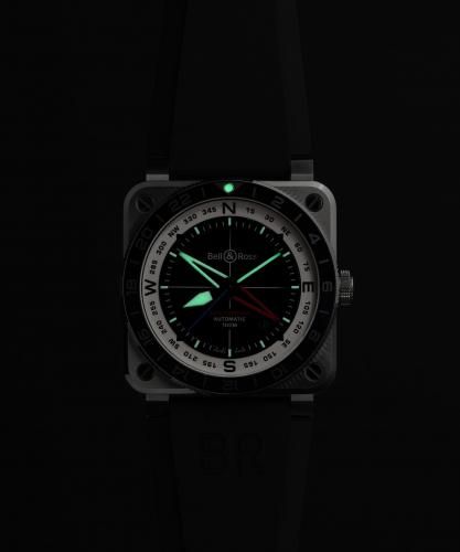 BR-03 GMTコンパスの文字盤がソーラーコンパスとしても機能します。文字盤外周の目盛りは360°全周をカバーし、ダイヤ型のGMT針によって日光下で方位を確認できます。ベゼルの4方位表示と24時間表示により、真のナビゲーションツールとして機能します。
